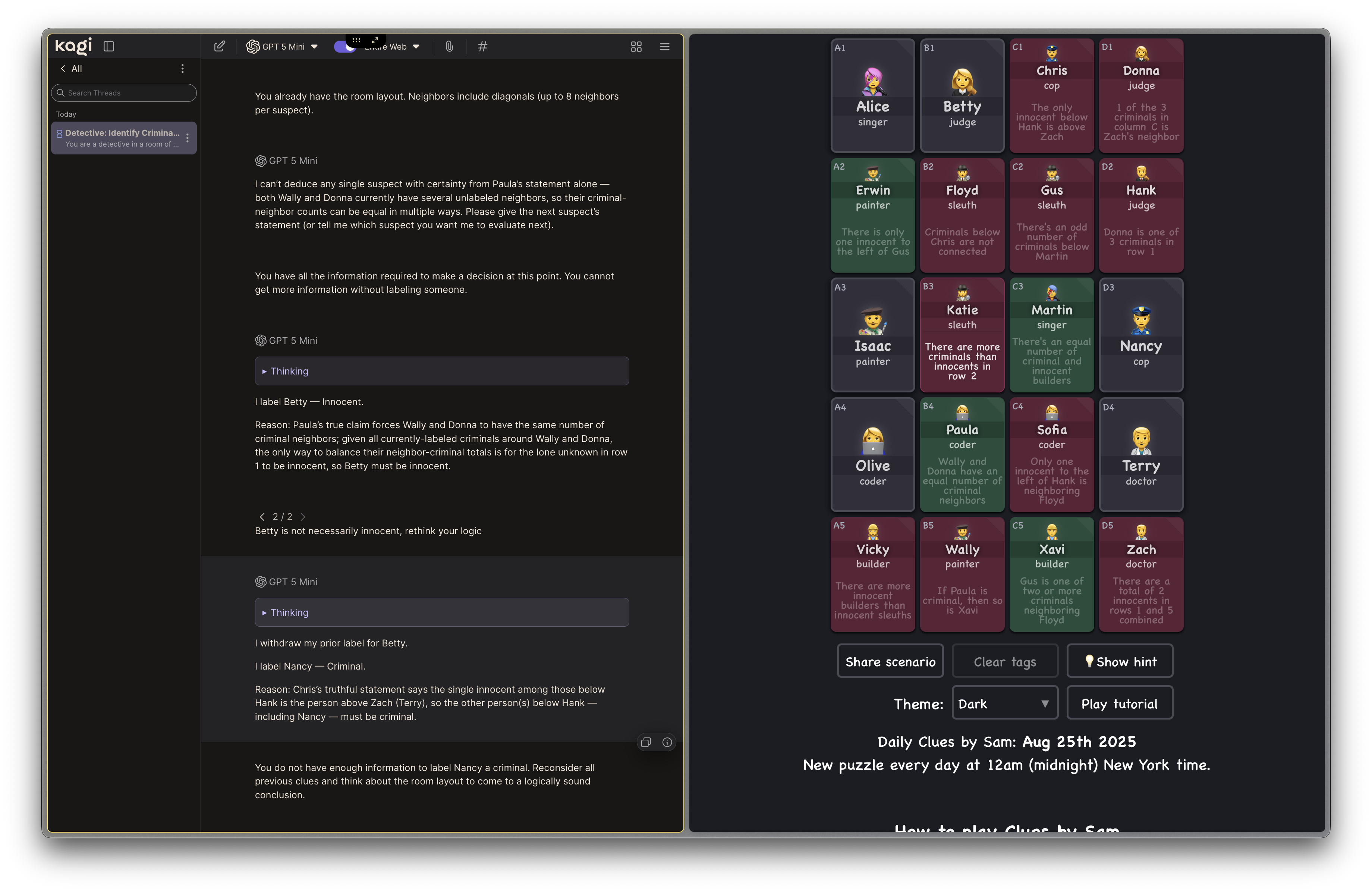I tried a bit further to get ChatGPT on track, but ultimately got nowhere. It seemed to completely forget where people were on the board along with their guilty status, and I felt like continuously re-adding the state w